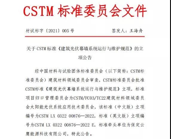 日前,由凯发k8体育APP旗下保定云鹰能源科技有限公司(下称“凯发k8云鹰”)申报的《建筑光伏幕墙系统运行与维护规范》团体标准成功通过中国材料与试验团体标准委员会审查并立项。该标准将填补建筑光伏幕墙运维领域空白,对规范建筑光伏幕墙系统设备运行与维护、助力光伏建筑一体化产业高质量发展具有重要意义。